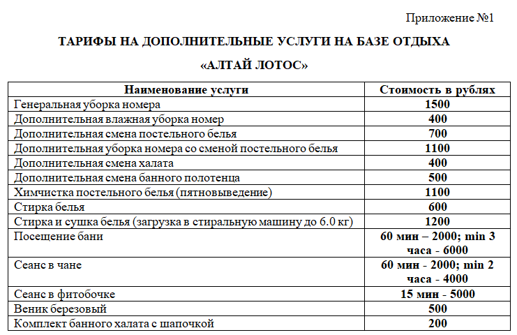 1. Стоимость размещения определяется базой отдыха в соответствии с категорией номера, количеством проживающих, перечнем услуг и тарифами, дополнительными местами.